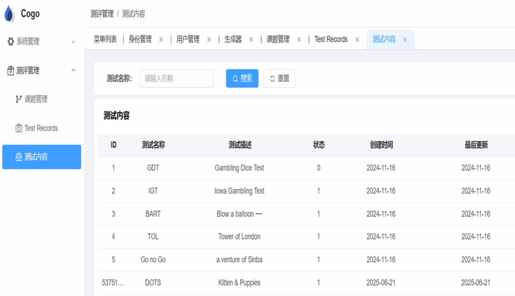 定制开发 游戏化心理评测系统 通过定制化的游戏任务和卡通化交互体验,我们高效采集受试者的行为数据,并支持数据分析与导出,提升实验参与度的同时,确保科研数据的严谨性 。 系统概览 目标 将心理测评转化为科学、趣味、可拓展的研究工具 适用对象 高校心理与认知科学学院、心理咨询机构、少年儿童培训机构等 应用场景 科研实验、学生心理发展测评、跨文化研究等 支持多平台运行,中英文版本 卡通化交互体验,适合儿童群体 支持语音引导 支持离线与在线数据采集 数据采集纬度 测试环境数据 受试者行为数据 完整实验日志 已包含的测试 服务端介绍 管理系统 用户 、权限管理/科目、实验管理 测评系统 数据分析与可视化报告/数据导出支持科研使用 可定制化与拓展性 内容定制: 根据研究课题设计专属游戏任务 拓展性: 可快速接入更多心理学测验方法 跨文化适配: 支持多语言,便于国际合作 成果与案例 与华东师范大学展开合作 用于大学级研究与实验场景 幼儿园、中学等多种受试群体和环境中进行实测 让心理学测评 | 更科学、更有趣、更高效
